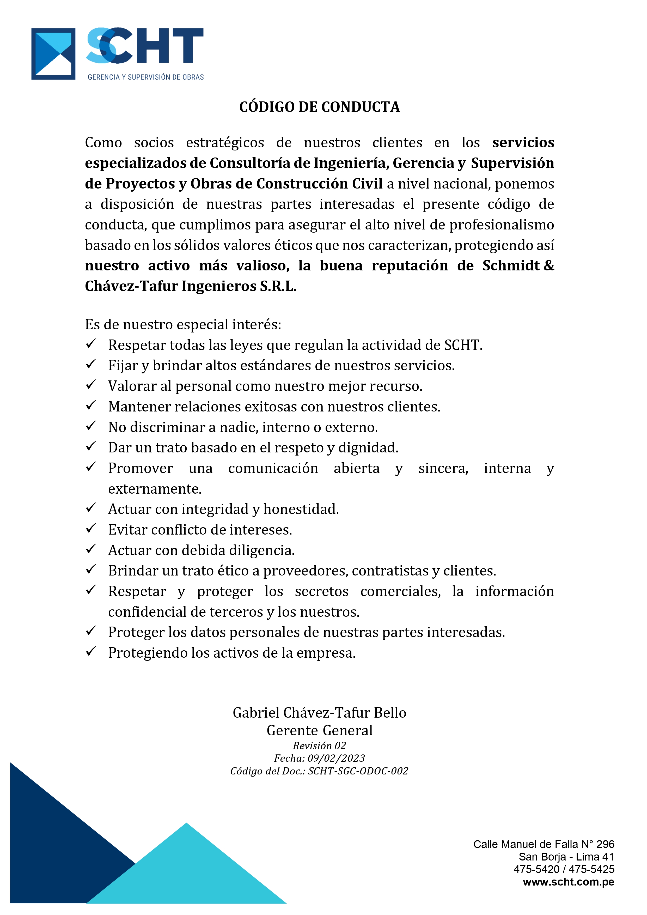 sólidos valores éticos que nos caracterizan, protegiendo así nuestro activo más valioso, la buena reputación de Schmidt & Chávez-Tafur Ingenieros S.R.L.