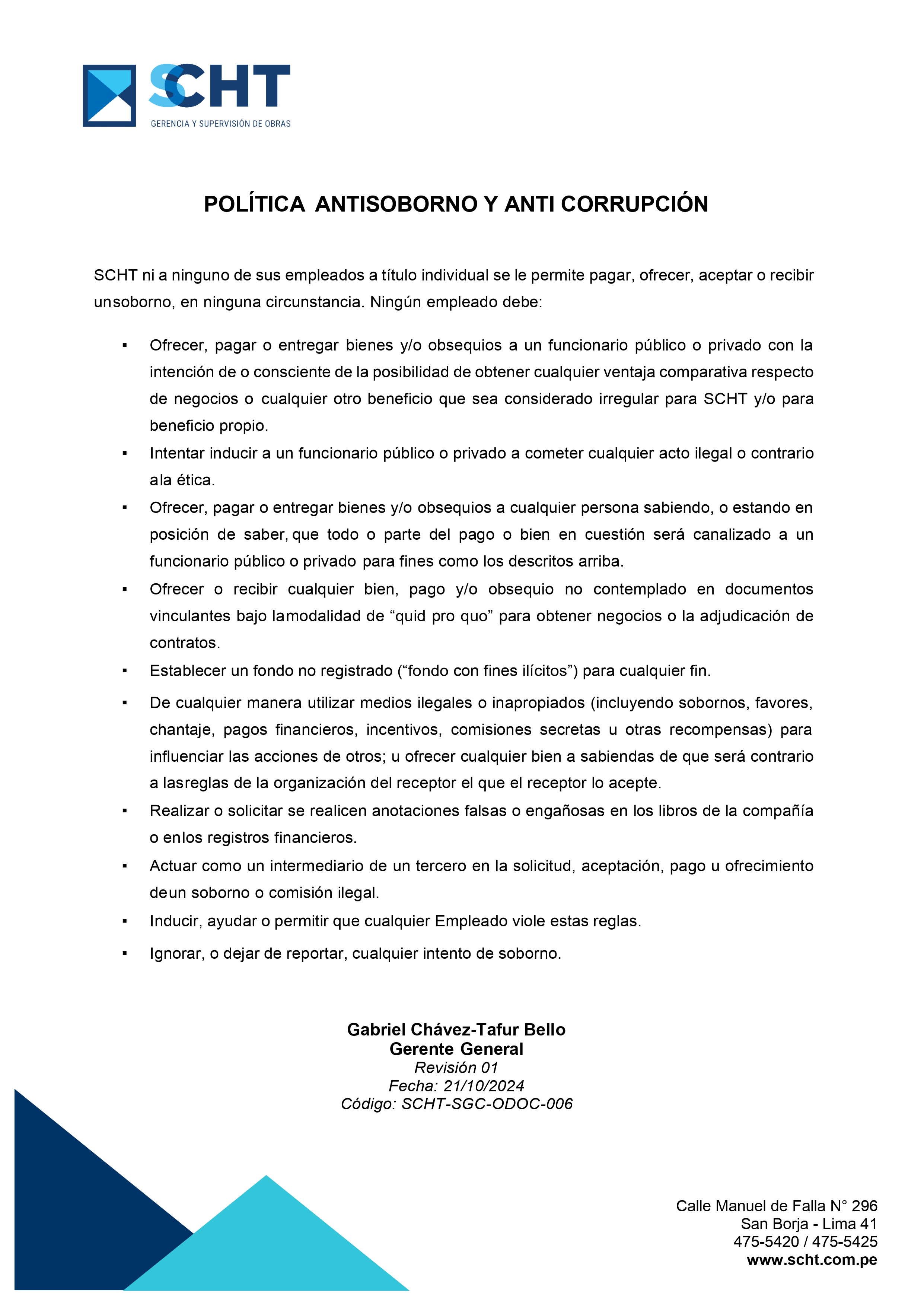 El marco legal peruano incluye, asimismo, normas que regulan y penalizan la corrupción. Violar estas leyes es un delito grave que puede traer como resultado sanciones civiles y penales significativas tanto para SCHT como para un empleado a nivel personal (incluyendo multas sustanciales y prisión), y un daño significativo a la reputación de SCHT. Es importante tener en cuenta que ignorancia de la ley no es admisible como excusa de su incumplimiento en un proceso legal.
