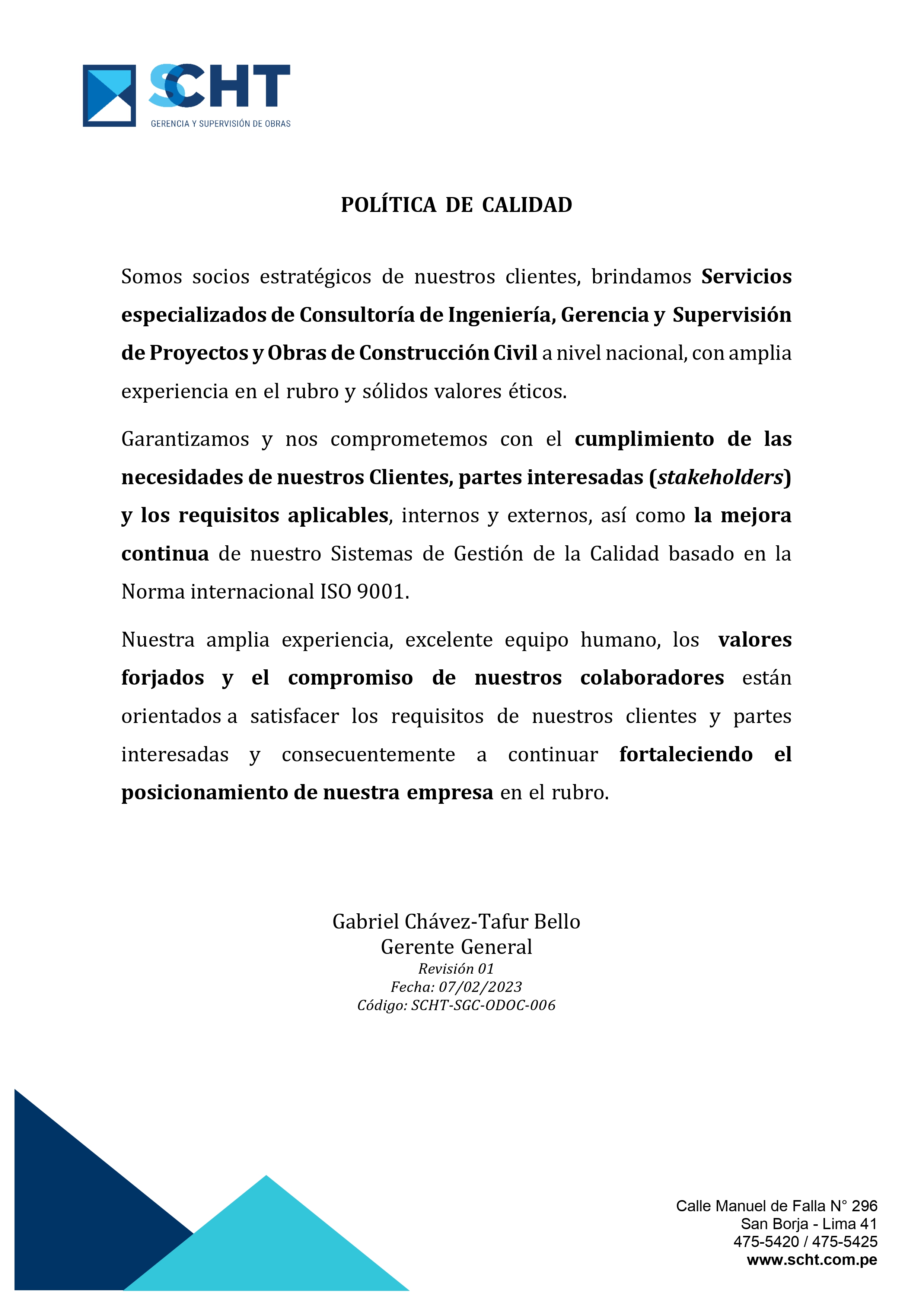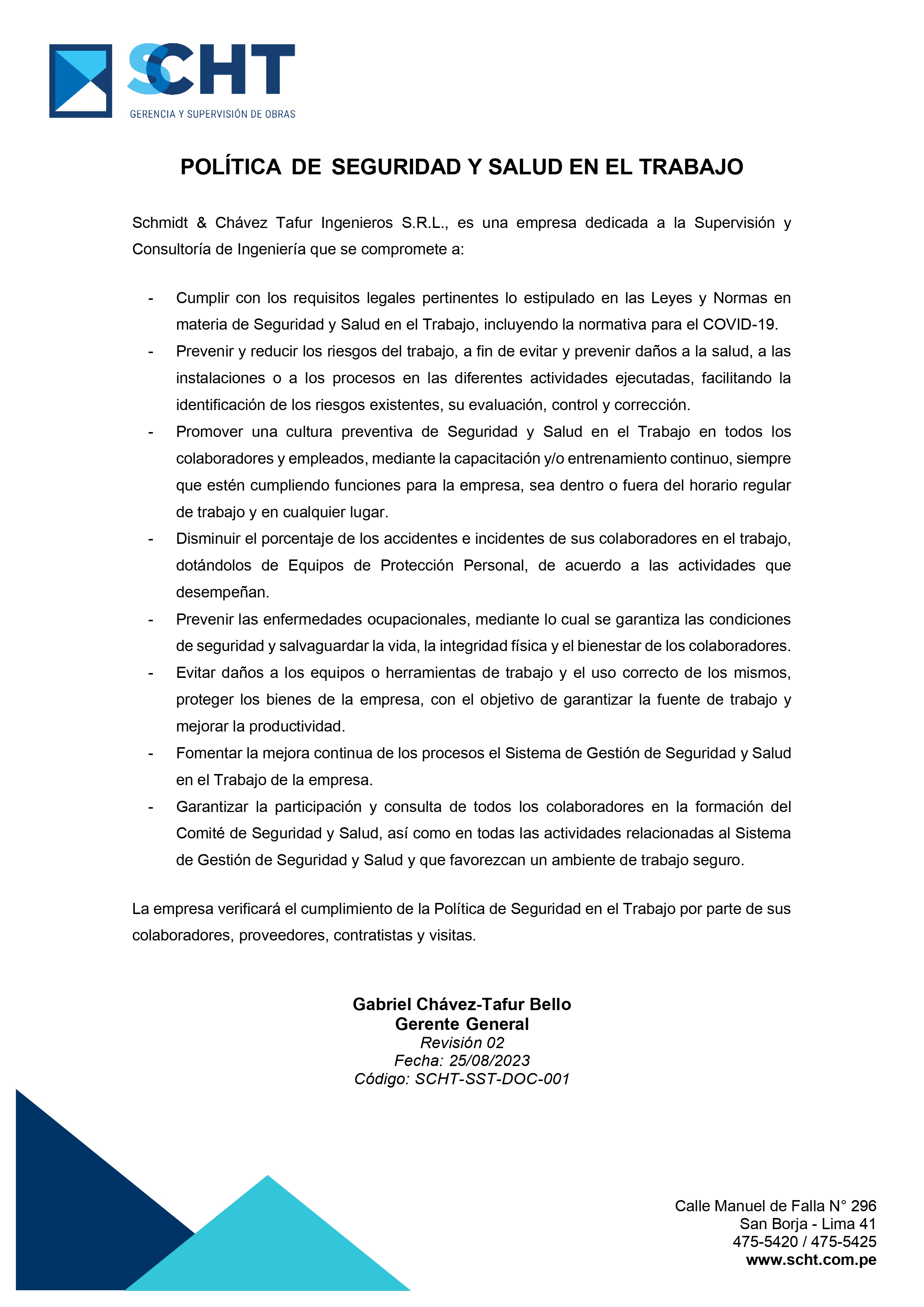 sólidos valores éticos que nos caracterizan, protegiendo así nuestro activo más valioso, la buena reputación de Schmidt & Chávez-Tafur Ingenieros S.R.L.
