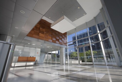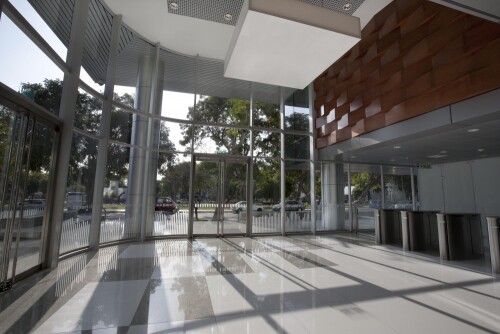 Además de 12 pisos para oficinas, en el 1º piso se desarrolla el hall de ingreso principal así como un área para tiendas comerciales y las rampas que dirigen a los estacionamientos