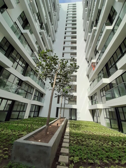 Edificio de vivienda de 6 sótanos de estacionamientos, 22 pisos y azotea.