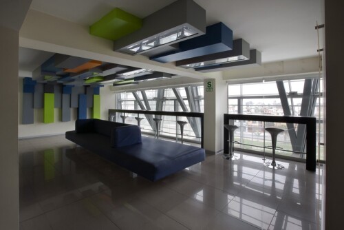 El edificio cuenta con hall de recepción, counter de atención, mesa de partes, atención al cliente, laboratorios de cómputo, aulas, área de certificaciones, caja, cafetería, servicios higiénicos, escalera, ascensores