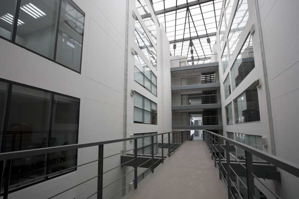 Los bloques existentes y el edificio nuevo han sido unidos por un corredor central que une todos los servicios en todos los niveles a fin de dar mayor fluidez a las funciones.