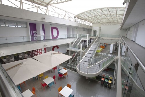Este bloque también cuenta con dos pisos superiores donde se encuentra el ingreso de autos, la cocina, la cafetería, los comedores y aulas.